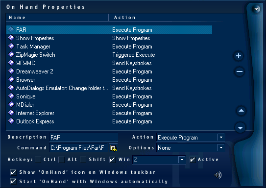 OnHand can make a hot-key combinations using 'Ctrl', 'Alt', 'Shift' and 'Win' key - modifiers. In comparison with built-in Windows functions, OnHand provides more possibilities for the choice of a hot key (~ \ / ' ; : . ,). At the same time, OnHand can show all assigned hot keys, simply by clicking on its icon on the System Tray.