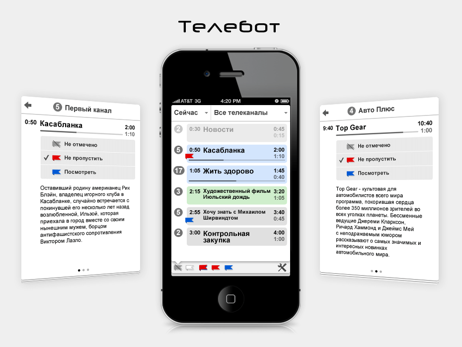 Телебот позволяет просматривать телепрограмму на неделю, по отдельным телеканалам и вперемешку, на определенный день и то что показывают сейчас и в ближайшие 3 часа.